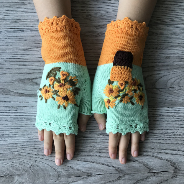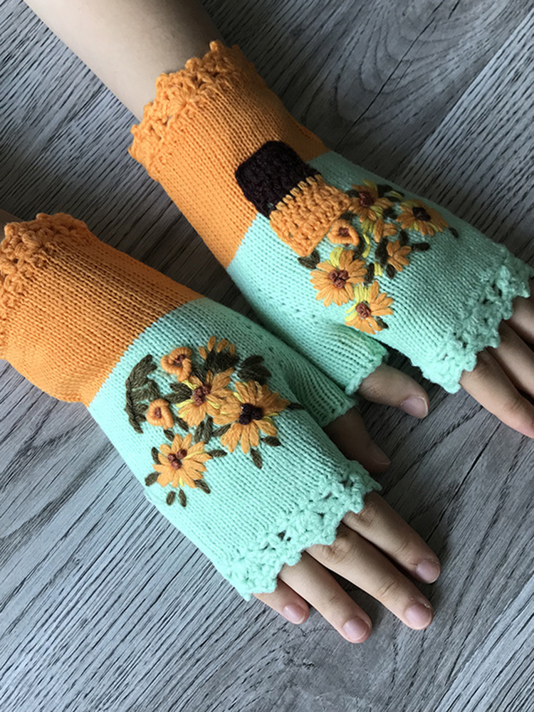 Vintage Daisy Embroidered Wool Knit Gloves